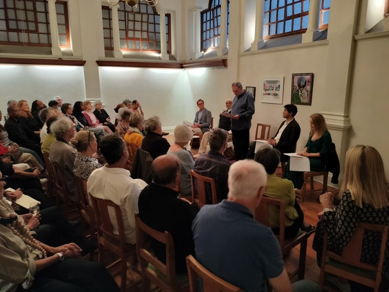 The scripted dialogue was 'performed' by Langley Kirkwood (a liberal Zionist), Royston Stoffels (a Muslim principal), Brent Palmer (a Baptist pastor on the Cape Flats) and Jenny Stead (a Jewish anti-Zionist) with John Maytham playing the role of facilitator.