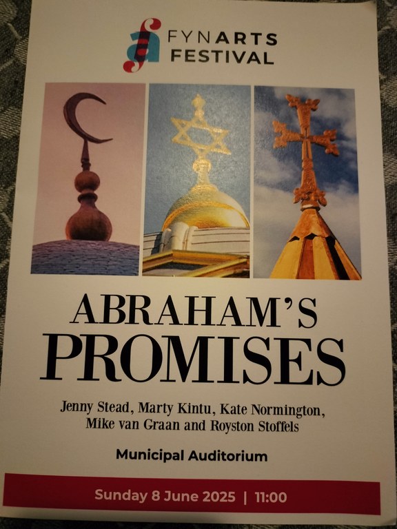 Abraham's Promises is a scripted dialogue initiated by the provocative question 'Are Jews safer today than they were the day before 7 October 2023?'. It takes the form of a panel discussion featuring representatives of the Abrahamic faiths. We were invited by the FynArts Festival to present the work on Sunday 8 June. There was a good attendance with interesting discussions afterwards including with the parents of someone who works for the UN and is in charge of aid distribution in Gaza! While there was no time for engagement with the audience as a whole which is what we would prefer, subsequent feedback confirmed that the piece achieved what it set out to do: to provoke conversations and debate and to encourage people to do further research around the themes of the piece.