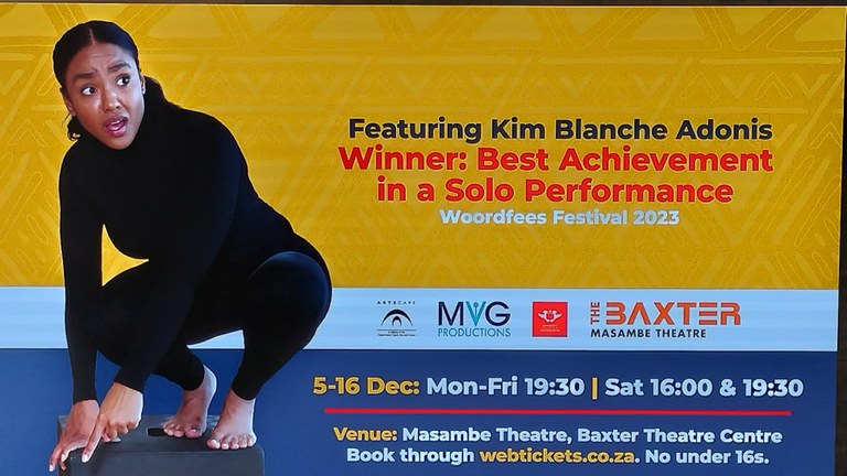 Having first performed My Fellow South Africans to an audience in a house in Tokai at the end of April, Kim Blanche Adonis ended the year with 104 performances under her belt, with the last two-week run taking place at the Baxter Theatre from 5-16 December. During the 8 months of touring the show, she performed in theatres, at festivals, in school halls, corporate boardrooms, hotel function rooms, churches, universities, retirement villages and people's homes!