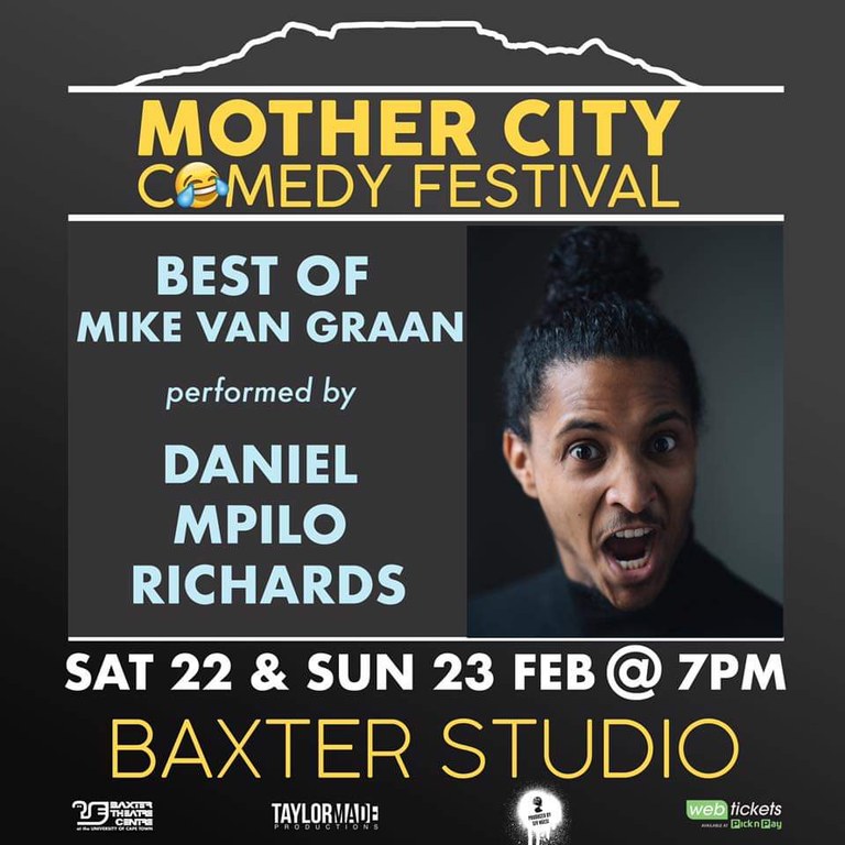 Daniel Mpilo Richards is back from studying film in the UK and will be performing a collection of sketches from Pay Back the Curry, State Fracture and Land Acts, my three satirical revues which we worked on together, directed by Rob van Vuuren. The two shows are part of the Mother City Comedy Festival and will take place at 19:00 on Saturday 22 and Sunday 23 February at the Baxter Theatre. Tickets may be booked through Webtickets or through the Baxter www.baxter.co.za.