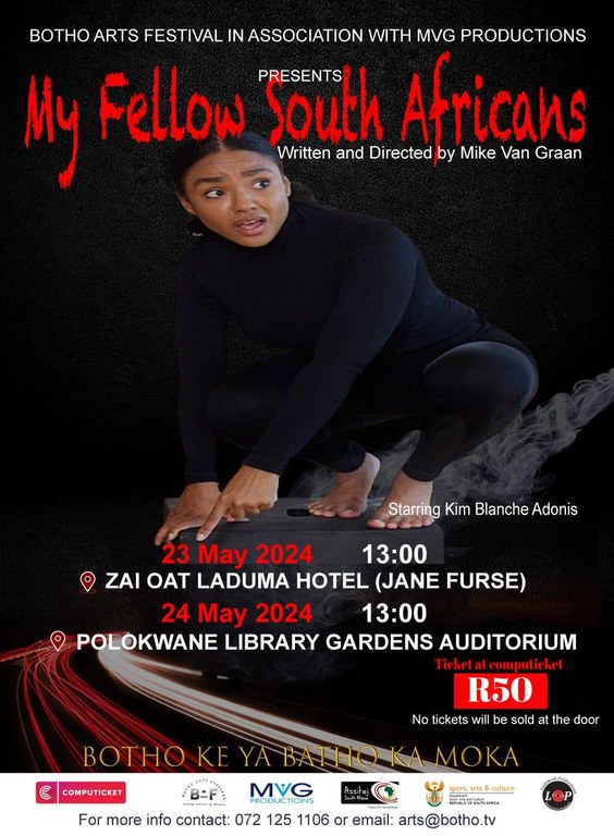 A few enterprising individuals in Limpopo initiated the Botho Festival and despite having been promised a theatre by the national Dept of Sport, Arts and Culture years ago, a promise that has failed to materialise, theatre-makers and producers have decided to bring excellent theatre to Limpopo. We were very happy to be invited to perform twice and Kim's performance was really well received. It has been part of our mission to take theatre to where people are, and we hope to continue to pursue our dream to present the play in the remaining provinces: North West, Northern Cape and Mpmulanga.