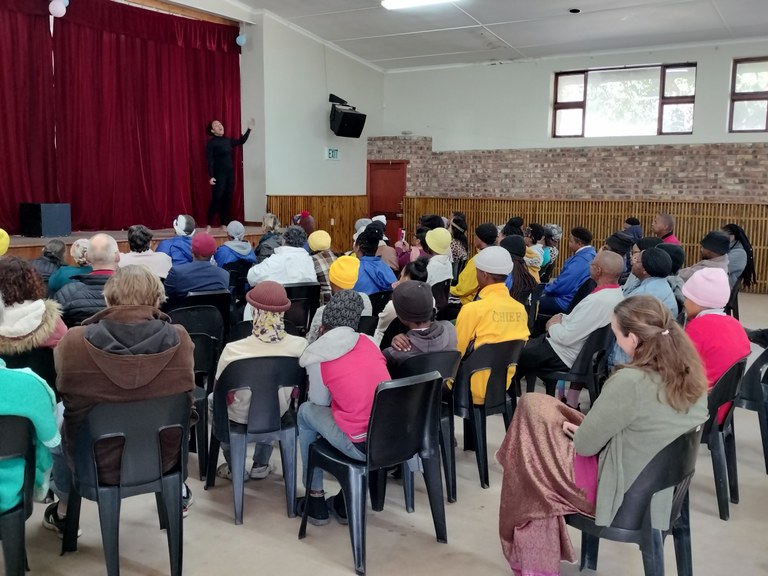 With two sold-out shows in Sedgefield, we agreed to perform the show for free for people who live in Smutsville, the 'township' part of Sedgefield, and where a large growth in a migrant network is taking place on the dunes causing much conflict between 'white' residents and those in need of shelter. We went on a walking tour of Smutsville followed by lunch in a local restaurant, after playing to about 80 people in the Smutsville Hall.