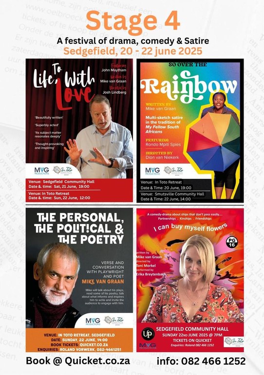 Last July, In Toto Retreat in Sedgefield hosted two sold-out shows of My Fellow South Africans. This birthed the idea for a regular Garden Route Theatre Circuit and at least for work heading to the National Arts Festival, to pass through George, Sedgefield, Knysna and Plettenberg Bay. With two shows registered at Makhanda, MVG Productions and In Toto Retreat decided to cohost Stage 4, three of my solo works - To Life, With Love; I Can Buy Myself Flowers and So Over The Rainbow - as well as a session in which I would talk about my work as a playwright and reading some of my poetry. This would take place from Thursday 19-Tuesday 24 June.
