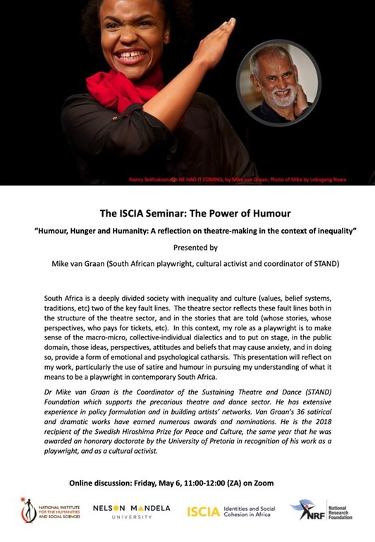 The Nelson Mandela University's unit dealing with Identities and Social Cohesion in Africa has been hosting a series of webinars on the theme "The Power of Humour". I was invited to make a presentation on how I employ humour in my work as a playwright at a webinar held on 6 May. It was a great opportunity to share some of my work and to engage with academics who work in a different way around these themes.